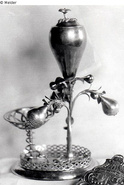 Gift to Chajim ben Horaw Mausche [Mosche] from the community of Kiev in 5450/1690 (according to inscription). Depicting the Tree of life, which sprouts with many roots from the fenced-in Garden of Eden (paradise). It bears flowers and fruit, the three large pieces of fruit on three different branches, serve as containers for three different spices. As the largest fruit, the largest blossom grows from the central stem of the tree as a Kiddush cup with cover, the latter decorated with flower and foliage. The Havdalah plate, with open-worked lattice lip, stands on a stem with the winding snake, the eye represented by a ruby. A crocodile and a stag are still cavorting in paradise. Unique. Silver and maker's mark.