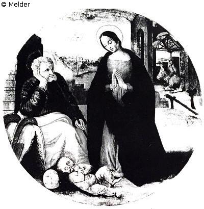 The Holy Family (Virgin Mary and St. Joseph) worship the reclining Christ child, in the background a lying ox and a donkey, covered, can be seen; a large-format Tondo