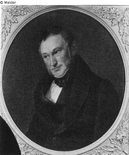 Ovales Brustbild in mit Eichenlaub verziertem Schnitzrahmen; Dreiviertelansicht nach rechts, Kopf etwa nach vorn geneigt; Backenbart; Jacke oder Mantel mit breitem Kragen, darunter weißes Hemd und dunkle Halsbinde; Signatur: Verso: Ternite. p: 1835; Maße: 33 x 29 cm