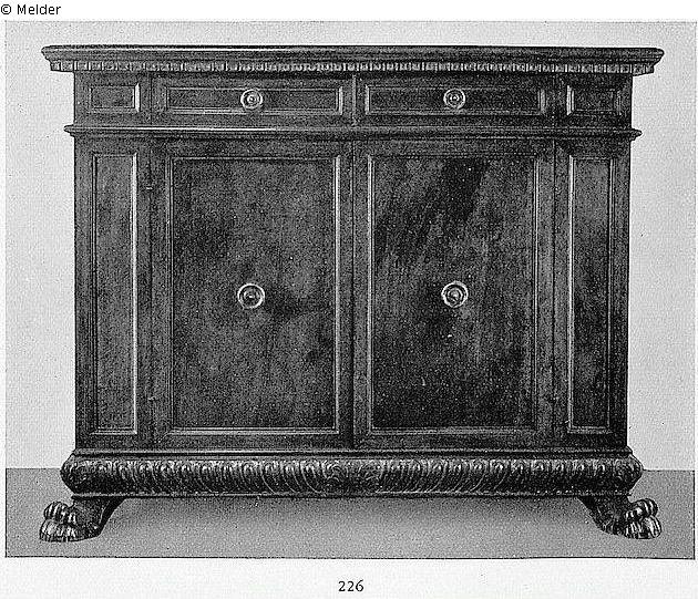 auf Prankenfüßen Sockelwust mit Flötenornament, darüber zwei Türen, in der Zarge zwei Schubladen, die Platte profiliert und mit Zahnschnitt, Messingknauf