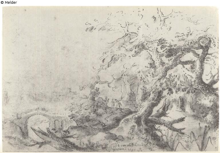 Zwarte Inventaris: 13-10-38. De Haspe, Rue des Saints-Pères, Parijs. Kleine teekening van Gillis van Valckenborgh, Boomstudie, pen en enkele kleurtjes, gemerkt (30,-); Inventariskaart: Boomstudie. Links steenen bruggetje, rechts boomen. Pen, gew. m. enkele kleurtjes. Praag 8674 [handschrift Carlos?]. De Haspe, Rue des Saints-Pères, Parijs. Opmerking: Tekening te Praag. Zie “correspondentie Praag”. Zie afbeelding uit Boon;