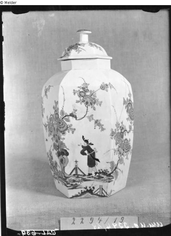 Supplement Oppenheimer: Ein Chinese im dunkelblauen und gelben Kleid vor einer Hecke unter einem großen blühenden Päonienstrauch, rechts ebenfalls Päonien, außerdem fliegende Schmetterlinge. Auf dem sechsseitig geschweiften Deckel eine chinesische Frau vor einer Päonienhecke. Abgeflachter Knauf mit goldenen Rosetten auf rotem Grund. In der Art von Loewenfinck. Deckel mit A.R.-Marke. Aus dem Johanneum Nr. 301 W.