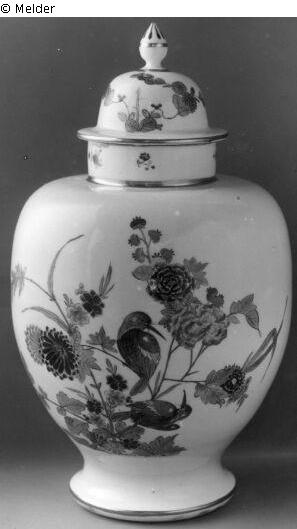 Kugeliger Gefäßkörper mit eingezogenem Fuß, horizontaler Schulter und zylindrischem Hals. Deckel glockenförmig mit überkragendem Rand und spitzem Knauf. Dekor in Rot, Purpur, Blau, Grün, Gelb, Braun, Schwarz und Gold mit freiem Dekor aus indianischen Blütenzweigen und einem Vogelpaar. Ränder vergoldet, "AR"-Marke. Meissener Porzellan mit Schmelzfarbenbemalung