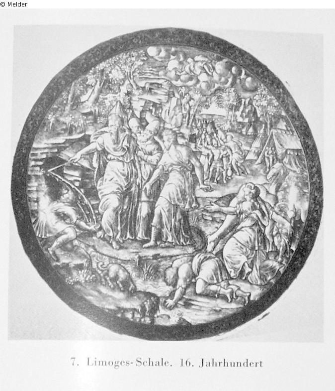 gewölbt, auf Fuß, rund, in Grisaillemalerei: Moses Wasser aus dem Felsen schlagend, auf Faß Fabeltiere, Goldarabesken und -streifen auf dunklem Grund. Holzsockel. Wahrscheinlich identisch → Inventarnummer 2 (Simonis - Limoges); Quelle: Galerie Fischer: Große Kunstauktion in Luzern. Sammlung Frau Hermine Feist, Wannsee u.a. am 20., 21., 23. und 24. Mai 1941. Luzern 1941. Katalognummer 7; Auktionsvertrag zwischen Dr. Hans Feist und Dr. Theodor Fischer vom 28.10.1940, in: Nachlaß Feist, in: Literaturarchiv Marbach; Abrechnung [...] über die verkauften Nummern an der Auktion vom 20./24.05.1941, in: Nachlaß Feist, in: Literaturarchiv Marbach