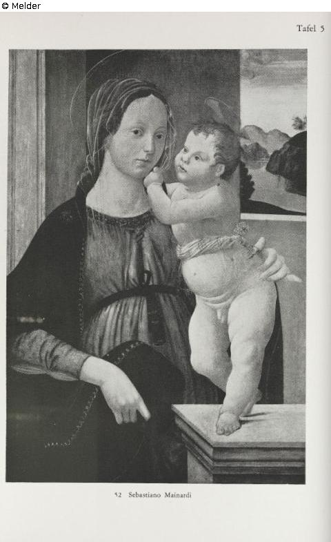 Die Madonna in rotem Gewand mit blauem Mantel, dessen geschütztes Ende sie mit der rechten Hand hält, blickt den Beschauer an und hält mit der linken Hand das auf einer Balustrade vor ihr stehende nackte Christuskind, das ihren Hals mit der rechten Hand umfaßt. Im Hintergrund graue Steinarchitektur und Ausblick rechts auf eine Berg- und Flußlandschaft. Goldener Rahmen. Aus der Sammlung Graf Erbach. Gutachten: Sirén ("...gehört zu des Meisters frühen Werken und ist eine der schönsten Madonnendarstellungen, die von im bekannt sind"). - Bode ("...ein besonderes tüchtiges Werk des Mainardi"). 12.10.1927. Ausgestellt in der Ausstellung "Oude Kunst" im Amsterdamer Rijksmuseum, Kat. 1929 Nr. 89 (mit Abbildung).