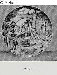 with a wide margin, painted with the three men in the fiery furnace. Right in the fire, the three intact, including two burning men left King Nebuchadnezzar and his companion. On the floor inscription. Reference: Paul Graupe: Gemälde, Kunstgewerbe aus verschiedenem Besitz, Ostasiatisches Porzellan aus dem Besitz der Prinz-Albrecht-Linie des vormals Preußischen Königshauses und aus drei Privatsammlungen. Auktion vom 20. und 21.10.1936. Berlin 1936.