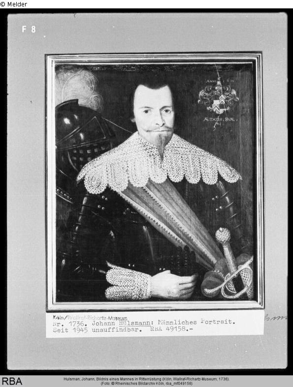 Search Request | Object report Male Portrait clothed in a Knight's Armor Knight with collar and sash Lost Art-ID585358 Previous Next Artist / Creator Hulsmann, Johann Birth 1610 / (vor) 1615, Niederlande Death nach) 1644 / (nach) 1646, Köln TitleMale Portrait clothed in a Knight's ArmorAdditional titleKnight with collar and sash Dating1634Object typePaintingGroup of reported objectsPaintingMaterial / TechniqueCanvas / paintedMeasures73 x 62 cm Inventory numberWRM 1736Description Coat of arms, upper right. Inscription: ANNO 1634/AETATIS SVAE/41. Read more Read less Provenance Until 1824 Ferdianand Franz Wallraf. 1824 Wallraf-Richartz-Museum, Cologne. Since 1927 on loan to Rheinisches Museum, Cologne-Deutz. Since 1945 whereabouts unknown. Read more Read less Published since30.01.2020 Contact Wallraf-Richartz-Museum & Fondation Corboud Obermarspforten 50667 Köln Germany Phone+49(0)221/221-22372Fax+49(0)221/221-22629Homepagehttp://www.wallraf.museum Contact Dezernat für Kunst und Kultur der Stadt KölnPositionMuseumsreferat, ProvenienzforschungPhone+49(0)221/221-22520E-Mailprovenienzforschung@stadt-koeln.de