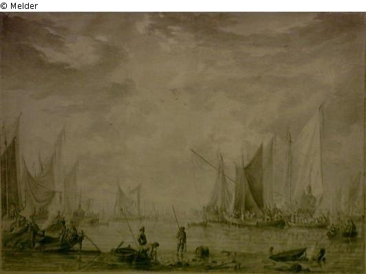Reihe von Segelschiffen im Hafen, dabei reichgeschmückte Gallione, im Vordergrund Fischer bei der Arbeit