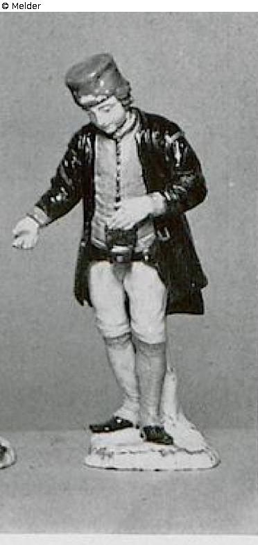 „Ein Markscheider mit dem Kompaß (um Leib an Gürtel befestigt), mit einer Klappe oder ledernem Deckel, den er mit der Hand in die Höhe hält.“ Standing, the left hand on the compass, with his right hand pointing aside. Copper-green cap, black coat, iron vest, gray-gray knee-length pants, gray leggings, black shoes. Base and base support in manganese brown and green. Right pointing finger missing. Without brand. Model of Simon Feilner, according to his own description the second of the 11 miner figures created by him. (See Scherer, as before.)