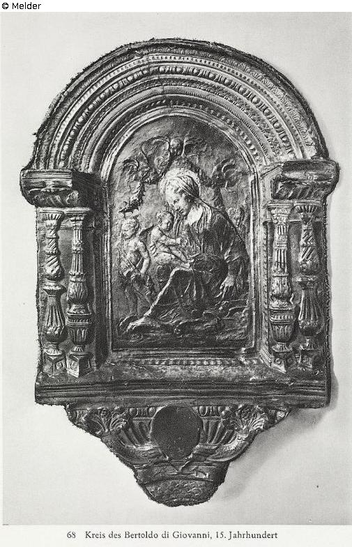 Mary sitting on a bench of clouds, that is held by angel heads; turned to the left, on her right leg sits the nacked child. Above her festoon with winged heads of putti, held by putti at the left and right. Multiply relief-moulded half-arcade, resting on columns at both sides. At bottom two dolphins, holding a peaked-oval shield. Cartapasta-Relief. Old paint. H. with Tabernakel 124 cm, Br. with Tabernakel 83 cm, measurements of the inner part 62x39 cm. published by W. of Bode in his book: " Bertoldo and Lorenzo dei Medici", Freiburg 1925, S. 63.