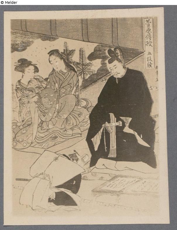 Minister Michizane is handed a scroll by a kneeling messenger; next to him a princess and servant; fifth page of a novel; colours: money, black, grey, red.