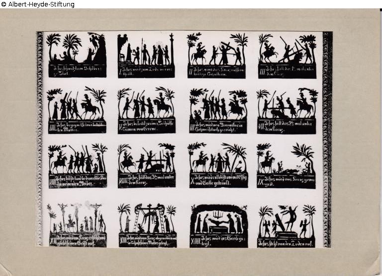 Print in the style of a silhouette picture in a narrow gold frame. 4 x 4 scenes from the Passion of Christ, each with a caption: "Jesus schwitzt am Oehlberge Blut. I. Jesus wird zum Tode verurtheilt. II. Jesus nimmt das Kreuz auf seine heilige Schultern. III. Jesus fällt das 1temal unter dem Kreuz. IIII. Jesus begegnet seiner betrübten Mutter. V. Jesus bekommt zu einer Beihülfe Simon von Cerene. VI. Jesus wird von Veronika ein Schweißtuch gereicht. VII. Jesus fällt das 2temal unter dem Kreuz. VIII. Jesus tröstet und bedauret die über ihn weinenden Weiber. VIIII. Jesus fällt das 3temal unter dem Kreuz. X. Jesus wird entblößt und mit Essig und Galle getränkt. XI. Jesus wird ans Kreuz genagelt. XII. Jesus wird am Kreuze erhöht und giebt seinen Geist auf. XIII. Jesus wird vom Kreuz abgenommen und in Schoß seiner Mutter gelegt. XIIII. Jesus wird ins Grab gelegt. Jesus steht von den Toden auf."