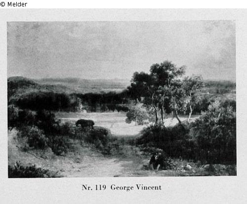Landscape in autumnal mood with a far view, in the foreground right side a farmer resting in front of some trees. G. R.