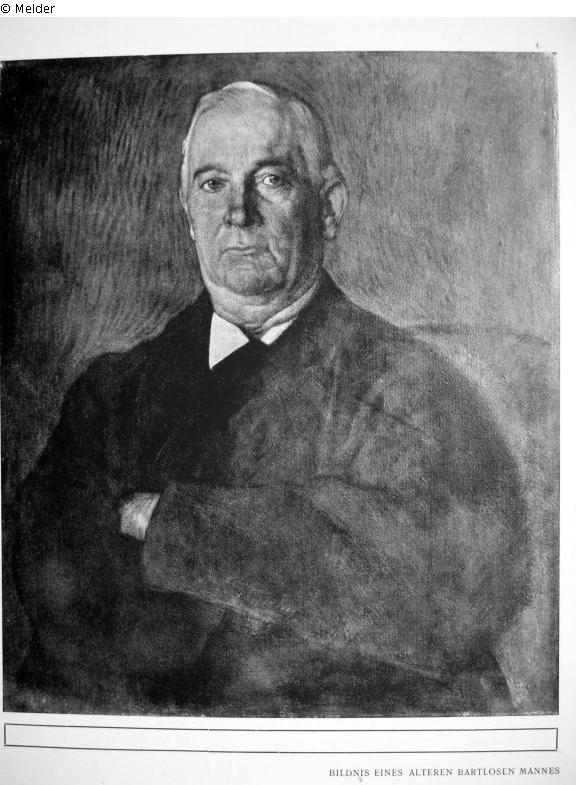 Vor grünem Hintergrund sitzt auf grünem Polstermöbel, lebensgroß bis zu den Hüften dargestellt, ein alter, aber noch rüstiger Mann im schwarzen Rock mit untergeschlagenen Armen, Kopf und Blick geradeaus. Das glatt rasierte ausdruckvolle Gesicht ist von grauem Haar umrahmt, der faltige Hals tritt über den weißen Umlegekragen hervor. Bez. r.o.: F. Boehle 1898; ausgestellt 1901 in Dresden, Große Kunstausstellung; farbig reproduziert in "Die Rheinlande"