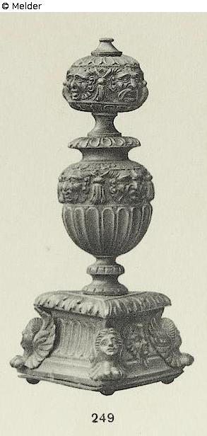 Of bronze, with greenish-black patina. Heavy three-sided foot with moulded female heads at the edges and a mask of a faun in the middle of the front side. The stem consists of a little and a big amphora above each other; both with "flute"-ornaments and relief-moulded frieze of masks. Bowl on top is missed, two smaller ones are attached. Source: Hugo Helbing Kunsthandlung and Kunstversteigerungshaus: Kunstbesitz eines Berliner Sammlers. Katalog Nr. 49; Math. Lempertz'sche Kunstversteigerung: Eine bekannte Süddeutsche Privatsammlung and anderer Privatbesitz, Katalog Nr. 395.