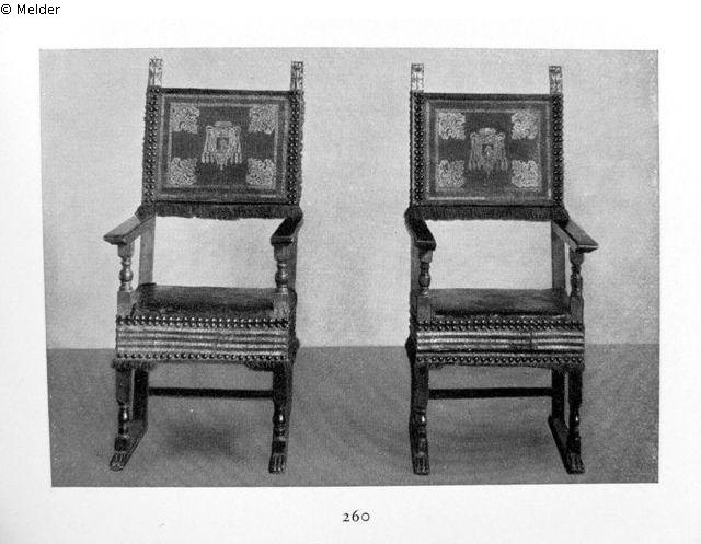 Light walnut. Box frame made of square posts, front legs and armrests turned, runners with lion paws. Gilded archivolts. Backrest, seat and frame. Gold-pressed leather upholstery.