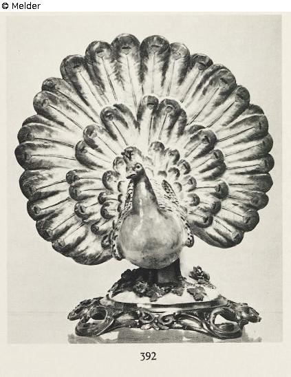 In gilded bronze mounting. The plumage in blue and ocher with black. Wheel green with blue and gold. Swords. (Bush on the head renewed). Bronze base with volutes and leaf. Counterpart to the following. See C. Albiker, Die Meissner Porzellantiere of the 18th Century.