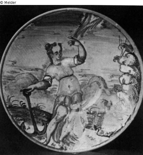 Belongs to a set of 13 plates and bowls (no. 142-157 in the 1830 inventory, no. 196-208 in the 1858 inventory), which, according to the 1858 inventory, had been given to the Kunstkammer by duke Ernest II of Saxe-Gotha-Altenburg, some of them being damaged; further note 1858: according to a letter by v. Murr, Nuremburg, dated January 11th 1791, the 46 majolica objects were purchased for 10 ducats.