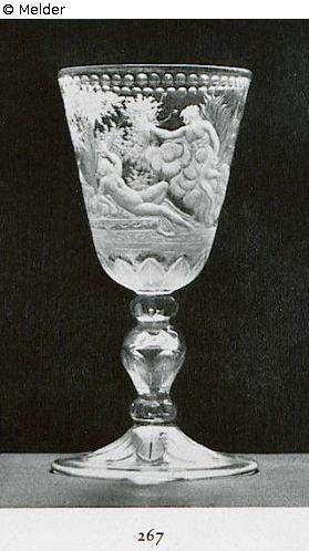 At bowl Jupiter appearing to Semele is wheel-engraved. Shiny bead trim, at stem and foot jagged leaves. Potsdam, beginnning of 18th century. Literature: Auktionskatalog Hans W. Lange, Wertvolles Kunstgewerbe, Berlin, 19.-21. Mai 1941, S. 63. Nr. 267, Taf. 42 (DOI: external link)
