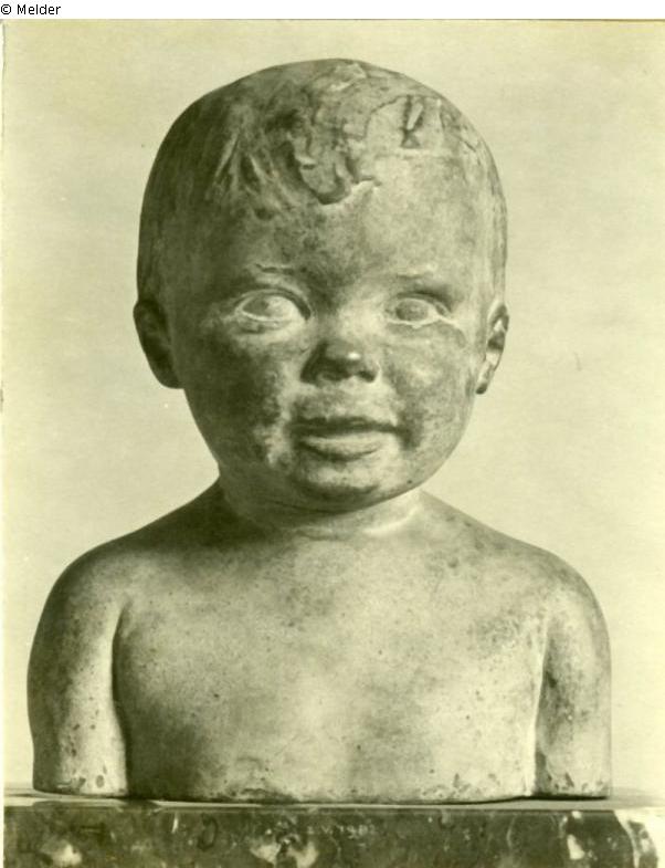 The little boy looks straight ahead, he is laughing; arms hanging down; chest cut transversely at the level of the nipples.