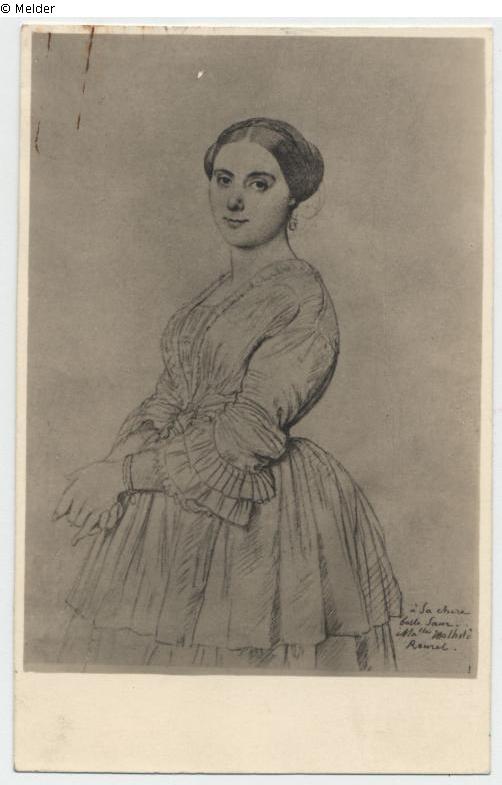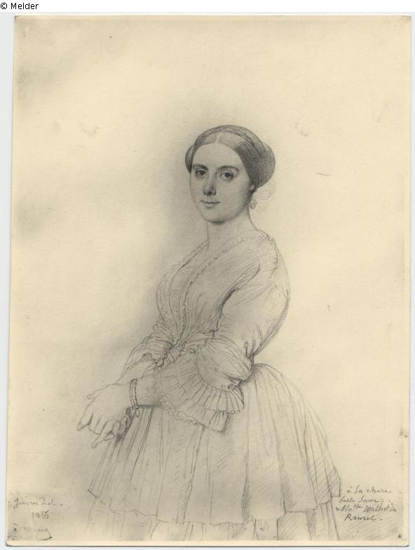 Kneeling figure of a standing lady turned to the left, her face turned towards the viewer, her hands clasped over her body; inscribed and dated lower left: "J. Ingres Del. 1855", inscription lower right: "A sa chère belle Soeur Mlle Mathilde Ramel"; on the reverse an exhibition slip: "Exposition Ingres 1911" of the Galerie Georges Petit with the indication of the owner at that time (Gustave Régnier)