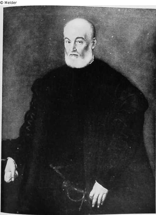 Der Dargestellte trägt ein dunkles, pelzverbrämtes Gewand mit Gürtel und degen, weißes Haupt- und Barthaar. Er blickt den Beschauer an und hält in der rechten Hand, die sich auf einen grüngedeckten Tisch stützt eine weiße Schriftrolle. Grauer Grund. Bezeichnet auf der Schriftrolle: "Titian ...". Goldener Rahmen. In neuerer Zeit restauriert.