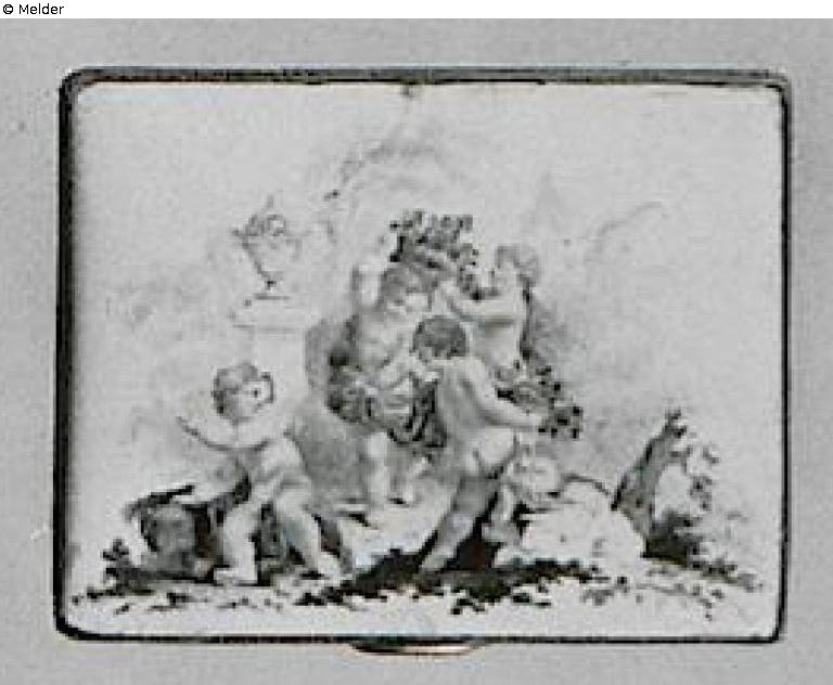 Painted colourfully, with putti, playing with flowers, in grey scenery. Inside cover: Lady at toilet table, a black servant offering her chocolate. Renewed, gold-plated silver fitting. German, around 1760. Literature: Auktionskatalog Hans W. Lange, Wertvolles Kunstgewerbe, Berlin, 19.-21. Mai 1941, S. 40. Nr. 157, Taf. 28 (DOI: external link)