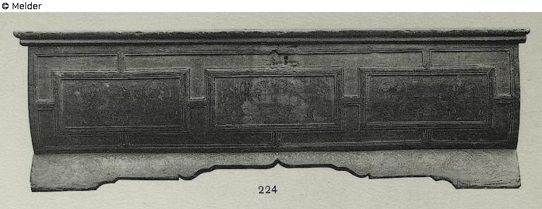 Painted colourful, nut wood. The frontside is cambared from top to the bottom, with three panels surrounded by shallow slats, coloured paintings inside: In the middle an emblem hold by angels, at the sides chimeras. At base moulding and side walls flowers painted in grisaille. Source: Hugo Helbing Kunsthandlung and Kunstversteigerungshaus: Kunstbesitz eines Berliner Sammlers. Katalog Nr. 49; Math. Lempertz'sche Kunstversteigerung: Eine bekannte Süddeutsche Privatsammlung and anderer Privatbesitz, Katalog Nr. 395.