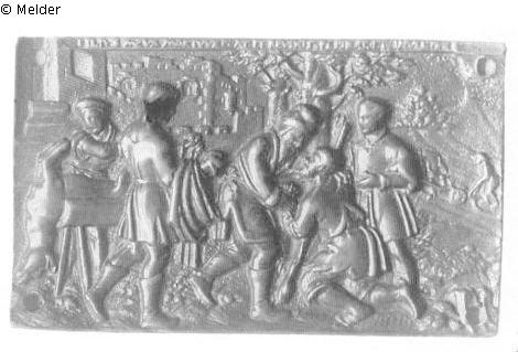 Rechteckige Plakette, in den vier Ecken Durchbohrungen. Der verlorene Sohn, in Lumpen gekleidet und den Wanderstab in der Hand, kniet vor dem Vater, der ihn zur Begrüßung in die Arme schließt. Der andere Sohn steht rechts neben ihnen, der dritte pflügt in der Ferne das Feld. Von links bringt ein Diener neue Kleider herbei, ein anderer schlachtet daneben ein Kalb. Im Hintergrund sieht man Bäume und ein großes, burgähnliches Gebäude mit Zinnen auf den Mauern. Am oberen Rand liest man die Inschrift FILIVS MEVS MORTVVS ERAT : ET REVIXIT PERIBAT ET INVENTVS [EST / LVCE XV]. Die Plakette stammt aus einer Folge von vier Darstellungen des Gleichnisses vom verlorenen Sohn nach den Stichen von Hans Sebald Beham von 1540 (Bartsch 31-34). Die gesamte Serie in etwas vergröberter Ausführung schmückt eine Nürnberger Tischuhr aus vergoldeter Bronze (um 1550) im Kunstgewerbemuseum in Berlin, weitere Verwendungen sind bei Weber aufgeführt. Auf unserem Exemplar fehlt das Monogramm L+D.
