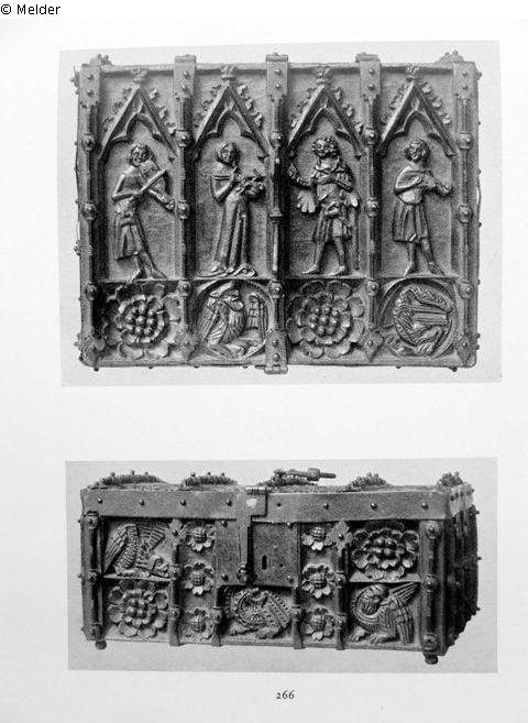 Flache Rechteckform. Eichenholz mit Eisenbänderbeschlag. Allseitig geschnitzt, auf dem Deckel unter Wimpergen zwei Musikanten, Dame mit Hündchen, den Pfeil gegen Herrn im Nachbarfeld zückend. Darunter abwechselnd Rosetten und Fabelwesen in Viereckfeldern, die auch die übrigen Flächen bedecken.