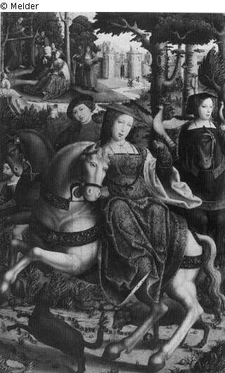 Panel painting: Depiction: Conversion of St. Mary Magdalene hearing Christ preach & life of St. Mary Magdalene before her conversion; e.g. dance, hunt; conversion; Christ; preach; hear & dance; hunt; huntress.
