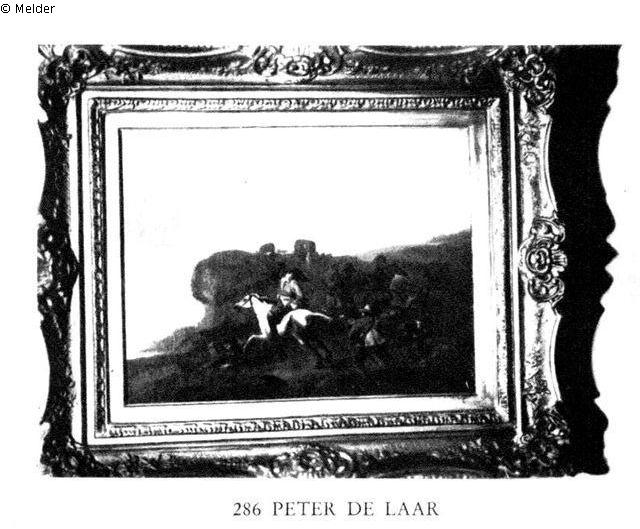 Hügelige Landschaft in bräunlichen Tönen. Im Vordergrund wird ein auf einem Schimmel reitender Mann von einem Räuber in roter Jacke beschossen. Bewölkter HimmelAbb.: Répertoire des biens Spoliés en France, Nr. 286
