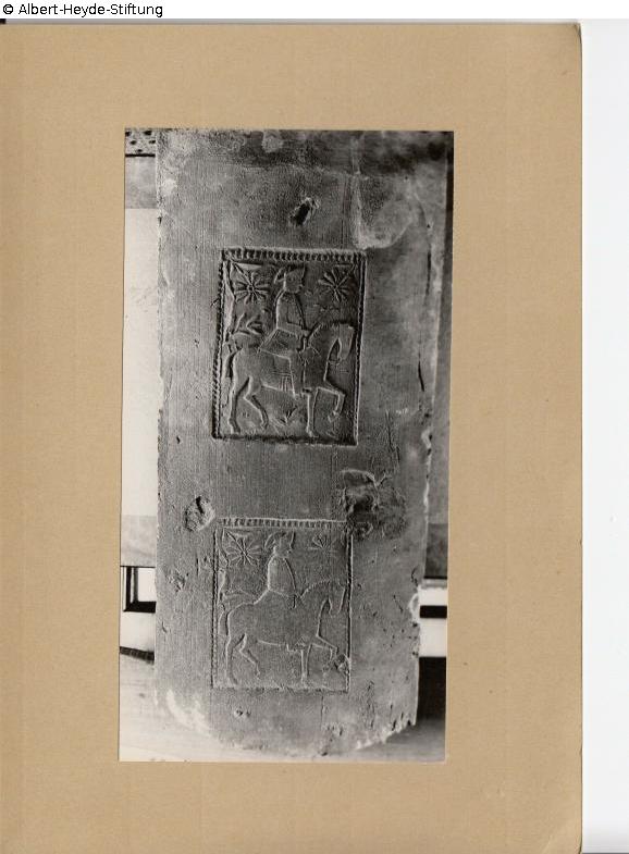 Double impression of a press mold rider with tricorn hat, rosettes. Feierabdenziegel (tile), on top of which are two impressions of a press mold, perhaps a baking model. Depicted is a Uniformed rider with tricorn hat, naybe Frederick II, between two rosettes.