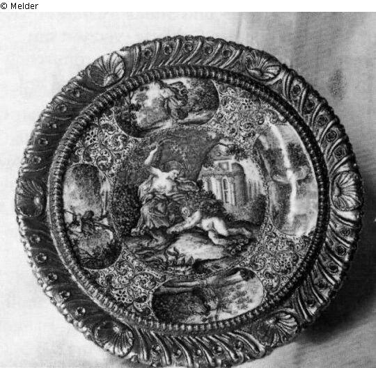 One of six footed saucers; enamel painting: a mythological scene on the well, framed by arabesques and four horizontal oval medallions each; rims decorated with moulded shell motives; belongs to Ahv 351 and 359 to 364.