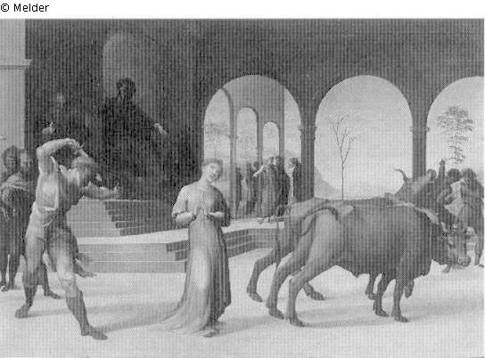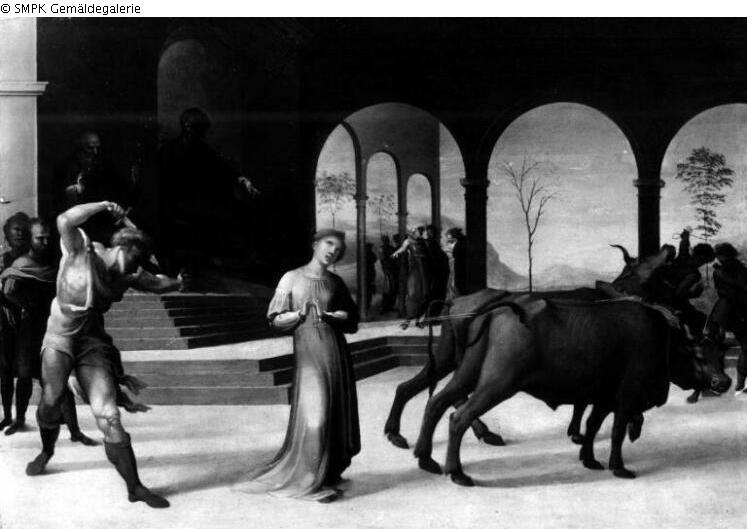Panel painting: depiction: St. Lucia is to be dragged by several oxen to a brothel, but cannot be moved; fetter; ox; drag; brothel