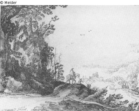 Links vorn an der Felsenhöhle ein Weg, auf dem ein Reiter und drei Fußgänger zu sehen sind. Im Hintergrund eine Meeresbucht, an der eine Stadt liegt. Rechts davon drei weitere Reiter auf einer kleinen Anhöhe. Signatur: Links unten: I.D.Momper 7 Julius / Rechts unten: 1629. Wasserfarben in braun und blau.
