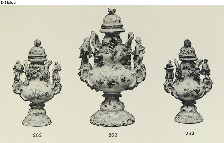 Bellied shape of an amphora on conical up-rising round feet. The relief-moulded decoration consists of rocaille handles, with cupids standing on it, gentlemen, ladies, also applied boquets and knobs of flowers; all painted colourful. Painted boquets of roses at the bodies. Slightly repaired. Mark of swords. Source: Hugo Helbing Kunsthandlung and Kunstversteigerungshaus: Kunstbesitz eines Berliner Sammlers. Katalog Nr. 49; Math. Lempertz'sche Kunstversteigerung: Eine bekannte Süddeutsche Privatsammlung and anderer Privatbesitz, Katalog Nr. 395.