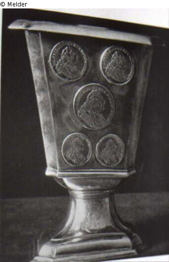 A German silver coin cup with coins from 1747 for the anniversary of the death of the ‘Old Dessauer’.