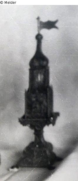 Square construction, spire-shaped with flag and monogram, spice box above the stem.