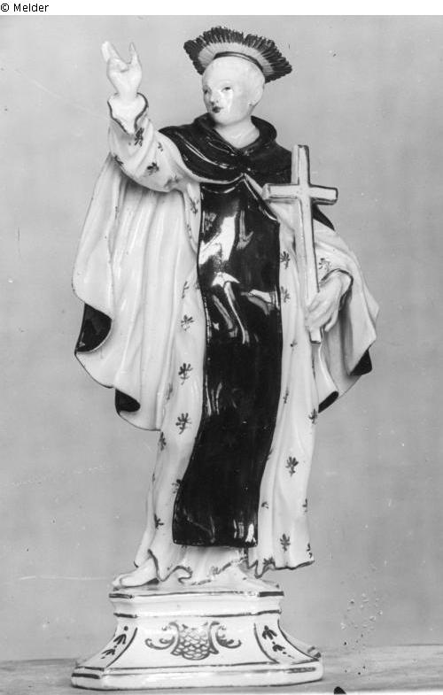 Meissen porcelain figure of St. Nepomuk with radiant crown, holding the cross in his left hand, right hand raised. Dressed in gold-flowered garment and black cope, pink lined. The right free leg stands out at the knee through the robe. The base is slightly decorated with gold.