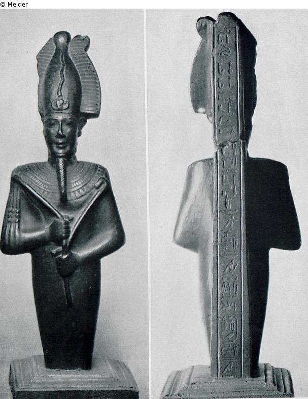 standing, scourge and crosier in his hands, on his head crown with snake, on the back pillar with detailed inscription with mention of the king Amasis Feet missing, head was broken off; dark green stone; Saitic period