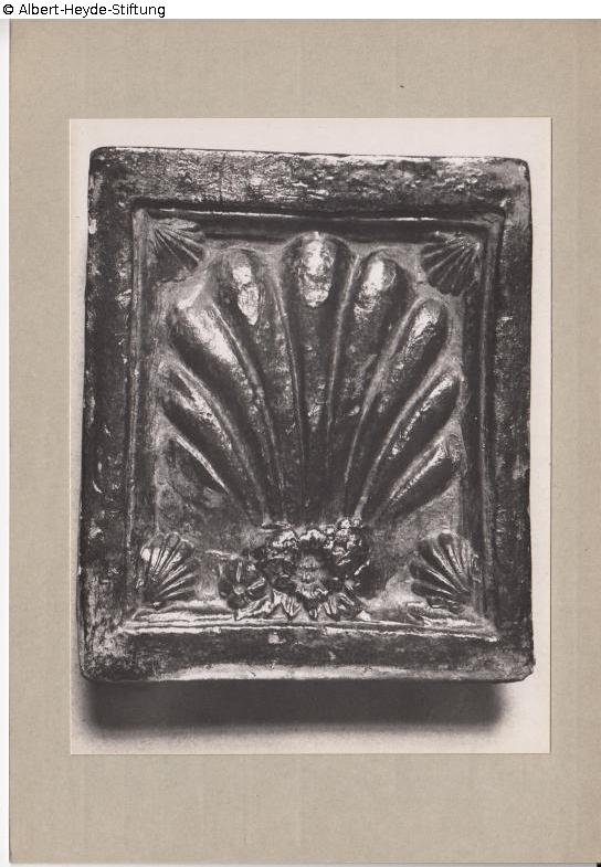 Rectangular, black glazed tile with a wide, fluted frame, containing a shell motif, also reduced in size in the corners.