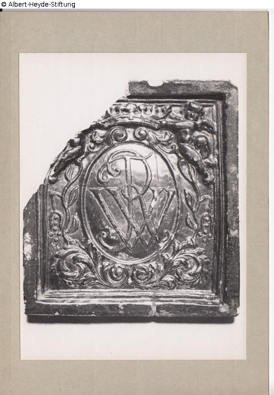 Rectangular stove tile with fluted frame inside. Oval cartouche wreathed by acanthus and laurel with the monogram „FWR“ (di King Frederick William I), above a crown held by two putti.