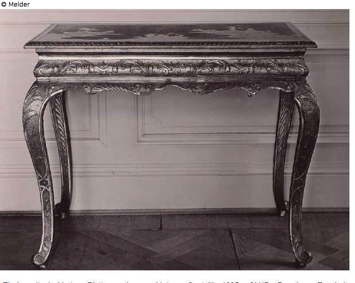The table top shows a lacquer work with a landscape depiction. It cannot be conclusively determined whether this was an Asian work or a Saxon imitation. Comparable works, also in the furniture holdings of the Saxon court, are attributed to Martin Schnell (1675-1740).