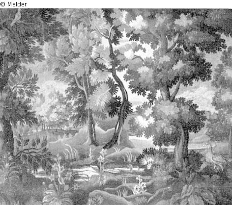 A river landscape with groups of trees; clusters of flowers in the foreground, bustard at lower right. Restored section at center.