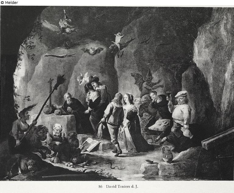 Inside a rocky grotto, that is open to the left, the praying aged Saint is kneeling at a lectern of stone with crucifix. In front of him to the right two couples in love in courtly costumes, behind them a sleepng woman on a donkey and a drunken farmer with vine glass on a pig ride up followed by devils and beasts . In front of Antonius an old woman is weighing gold next to a dog-alike creature, from the left a witch with a long broom on a lion is riding up. In front of her another one lying with a torch and an apple. Up in the air between fighting monsters a bat, dragon and fishes are riding on fishes resp. birds. In right front a gullet with stone blocks with jar and bowl. Signed at the right bottom at block of stone: D Teniers f. G. R. Notes at backside: Auction Bourgeois Frères, Heberle Köln Nr. 85, also seal with Saint George. The painting appeared for the first time 1831 at an auction in London. Collection Charles Brind, London, where ist was registered by John Smith in 1844. Exhibition of old masters out of private property in Vienna, Vienna 1873, Nr. 168. Collection Chevalier de Lissingen, Auction Paris 1876, Nr. 44. Gallery Sedelmeyer, Paris. Collection Bourgeois frères Köln, Auction 1904, Nr. 85. Collection Otto Gerstenberg, Berlin. Literatur: John Smith, Catalogue raisonné, Sup. Band, Nr. 13. Source: Hugo Helbing Kunsthandlung and Kunstversteigerungshaus: Kunstbesitz eines Berliner Sammlers. Katalog Nr. 49.