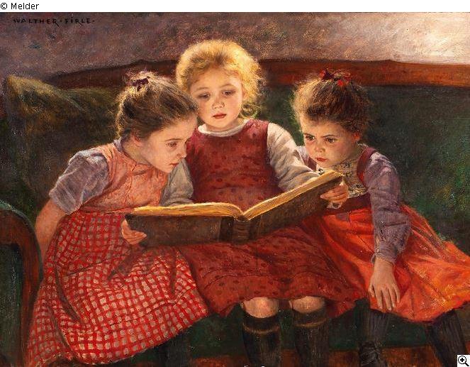 Three little girls while looking at a picture book