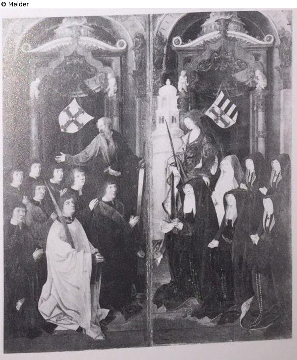 Norris: "ENGELBRECHTSEN, Cornelis. 2135. Altarpiece, with wings. The Feeding of the Five Thousand, with St Paul and St Barbara and male and female members of the Donor's Family. Central panel, 115 by 5 cm. Wings, each 115 by 51cm."