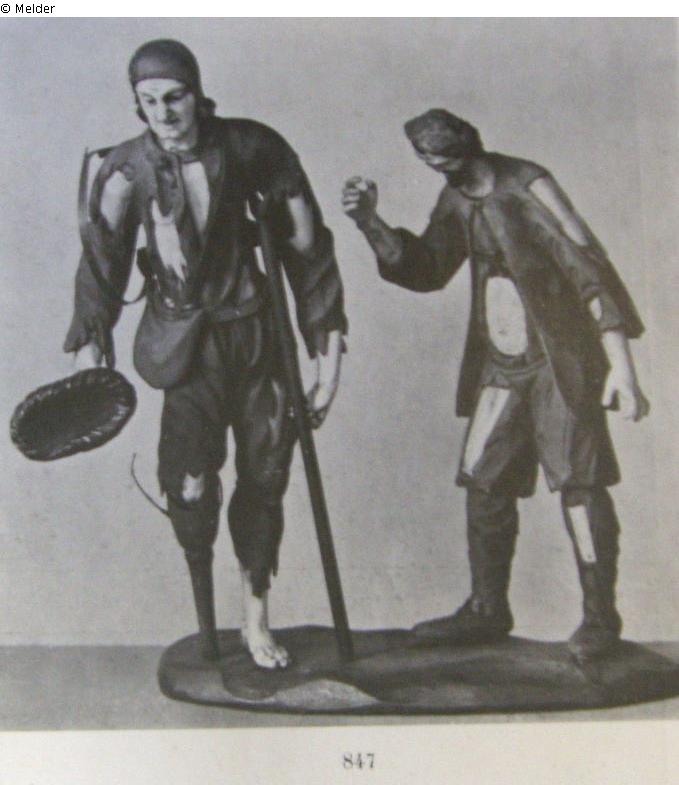 Holz und Elfenbein von Veit [G]rauppenberg, um 1731 in Bamberg nachweisbar; Beschreibung Berliner: "Der eine mit Krücke und Stelzfuß, umgehängten Sack und Tasche hält in der Rechten eine Pelzmütze; der andere sieht in seine erhobene Rechte. Vollrundfiguren. - Elfenbein und mehrfarbiges Holz. Die Pupillen des Krüppels geschwärzt. Der andere mit gelblich getöntem Gesicht, braunen Augenbrauen, roten Augenlidern und Mund; die Haare in schwarzbrauner Masse. Abgebrochen: am Krüppel beide Daumen und Teile der Riemen. Auffallend die Verschiedenheit des Stils der beiden auf gemeinsamen Sockel stehenden Figuren."; Inventarverzeichnis Sammlung Rosenbacher;