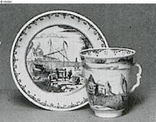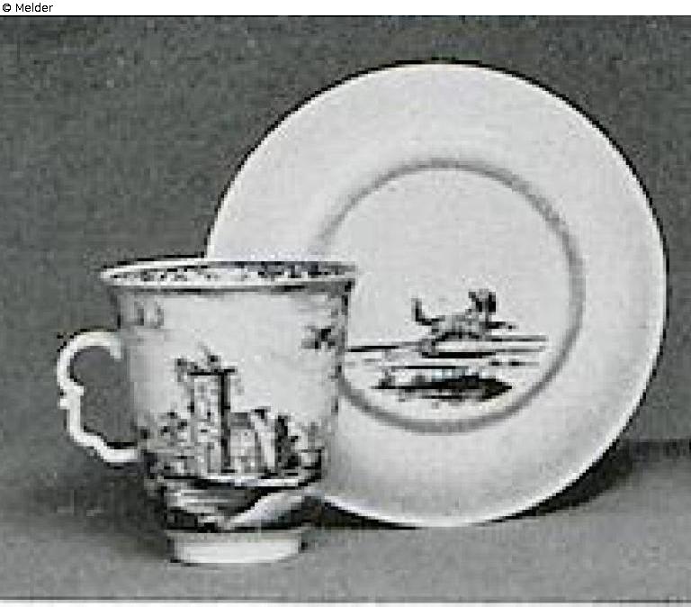 The tall cups have handles with relief-moulded thumb rests. Painted with river landscapes and trims in black enamel colour. At bottom of saucers dogs. Without mark. Vienna, by Du Paquier (1718–1744). Literature: Auktionskatalog Hans W. Lange, Wertvolles Kunstgewerbe, Berlin, 19.-21. Mai 1941, S. 126. Nr. 622, Taf. 75 (DOI: external link)